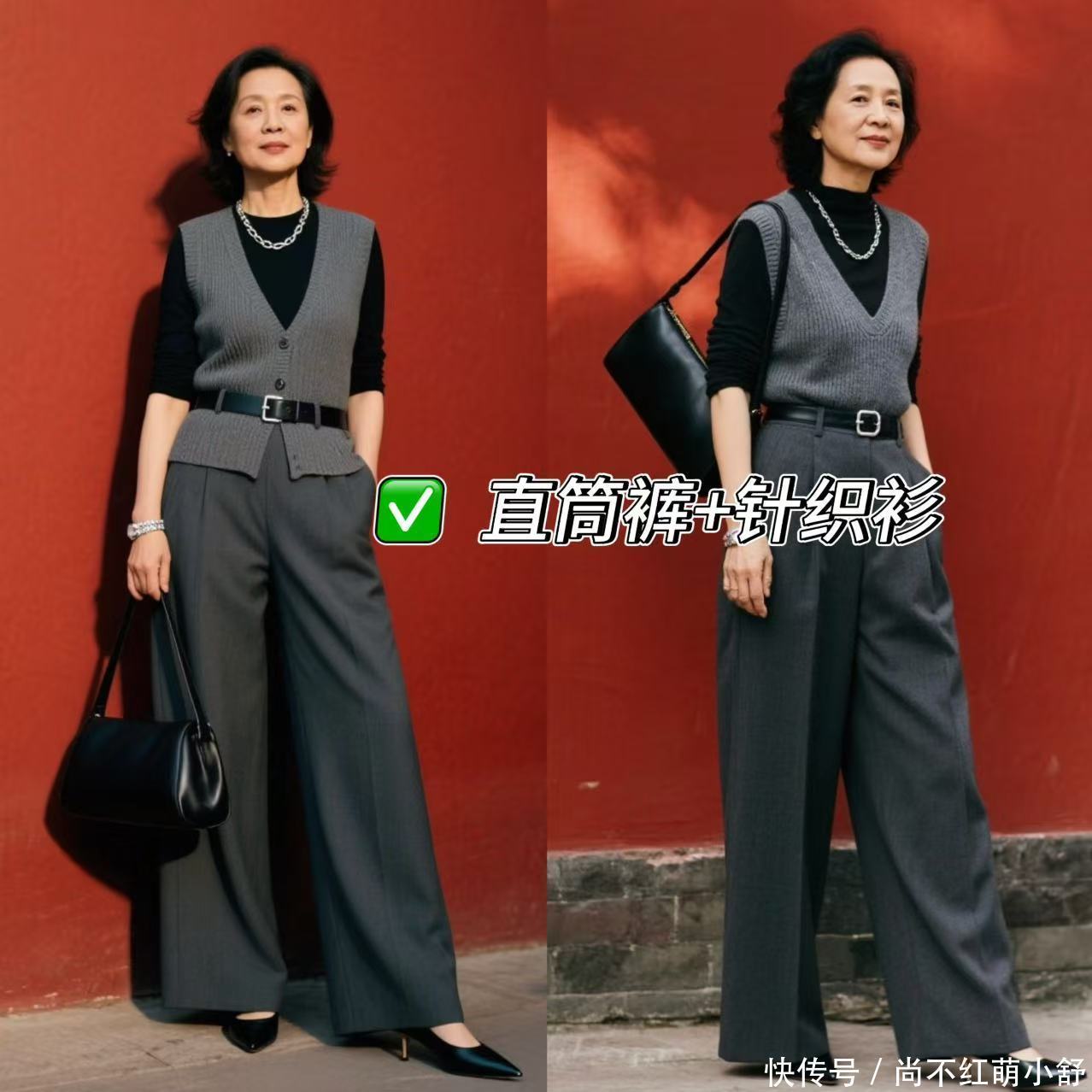 穿搭示范:看前锋博主这套打扮,接收灰色的直筒裤,牢记裤子选高腰款,搭配同色系的马甲,内搭一件玄色真挚衫,加一条细腰带明确腰线,举座知性通勤风。