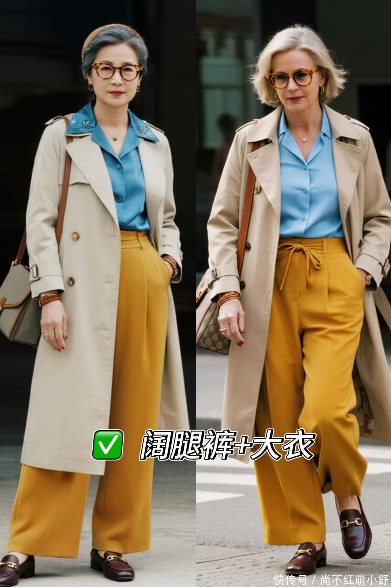 穿搭示范:50岁女东说念主不妨斗胆试试柚黄色阔腿裤+燕麦色的风衣,内搭一件蓝色衬衫,再配上一件棕色的乐福鞋,既洋气又气质。这套搭配的优雅,是紧身裤长久给不了的超逸。